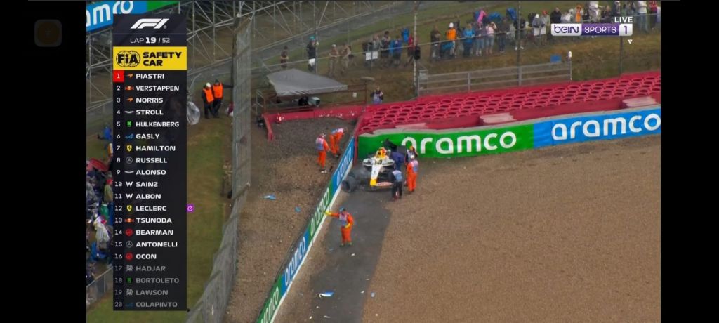 He was unsighted by Antonellis Mercedes and crashed in an unusual spot on the outside of Maggots. A high speed scare for the young frenchman. It’s a disaster of a day for VCARB with both cars now out and lots of damage done. Piastri says the puddle in turn 2 is the most dangerous on the track.