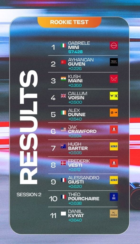 Formula E have completed their first Rookie test in Berlin today. Ireland’s Alex Dunne did a 57.968 in the afternoon session which would have put him in the top 10 in FP1 for last weekend’s championship race. Although those times were not set in the exact same conditions it is still a great benchmark and a competitive time. In first position was F2 compatriot Gabriele Mini with a 57.420. A great time which would’ve put him at the top of the timing sheets in last weekend’s FP1 session again for the actual event. Mini took over the World Champion Oliver Rowland’s Nissan car for the test and did not disappoint. McLaren junior teammate Ella Lloyd was the second fastest of the female drivers in 18th in the afternoon session ahead of Jamie Chadwick, Ella Weiss, Jonathan Hoggard and Bianca Bustamante.