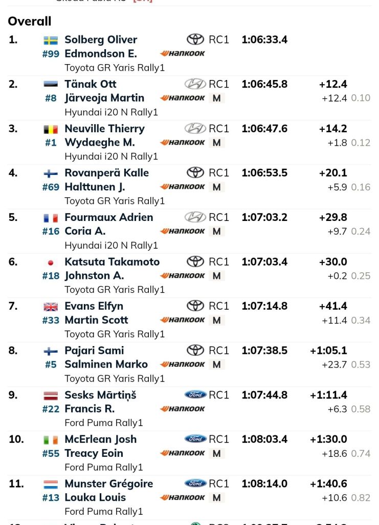 Day 2 at rally Estonia has finished with a suprise leader with Wrc-2 regular Oliver Solberg leading in a once off outing in a Toyota Yaris Rally1 car. The Swede said he has one objective and it is to get to the end of the rally however, after day 2 it seems that he is now after top honours at what is the largest sporting event in the Baltic regions. After the day he leads by 12.4 seconds over Ott Tanäk with Hyundai teammate and reigning world champion Thierry Neuville in 3rd. Neuville was joint fastest with Takamoto Katsuta through the Elva Linn super special stage on Friday evening. 4th is Kalle Rövanpera who has had a slow but steady start to the rally 20 seconds off Oliver Solberg at this point. 5th was Adrien Formaux who gained confidence and speed as the day went on as he posted some very competitive times throughout the day. 6th was Takamoto Katsuta who has had a fairly lackluster day behind the wheel of his Toyota Yaris Rally1 machine with the super special being his only real showing of performance so far. 7th was championship leader Elfyn Evans who despite cleaning the road all day he could still boast up some reasonably fast times and is 41.4 seconds off the lead. He will have a better road position so hopefully he is hopeful that he can make some progress tomorrow. 8th with some issues throughout the day was Sami Pajari. In the morning Pajari lost over 30 seconds throughout Stage 4 and 5 with power unit issues and then in the afternoon losing a further few seconds with a handbrake issue. The Finn was clearly frustrated at some points throughout the day but showed some pace on the last few tests. 9th and heading the M-sport crews home tonight was Martin Sesks. Sesks got off to a cautious start and a spin on SS2 didn’t help either but come stage 6/7 Kambja 1 & 2 he was right up at the sharp end posting times on par with Ott Tanäk. 10th was Josh McErlean who has been keeping his Puma between the hedges but the Irishman feels as though he is leaving a bit to be desired aboard his Puma. And 11th was Gregoire Munster. The Luxembourger is also playing the long game keeping his Puma on the road.